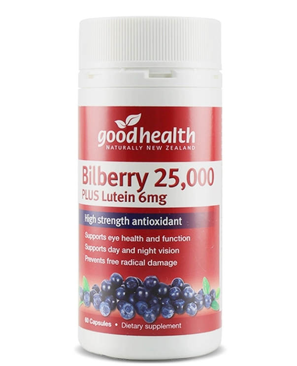 Good Health Bilberry 25000 plus Lutein 6mg is a high strength formula designed to support eye health, particularly the macular, retina and lens of the eye. This powerful combination support visual clarity, eye strength, focus and the ability to cope with eye strain and night vision.