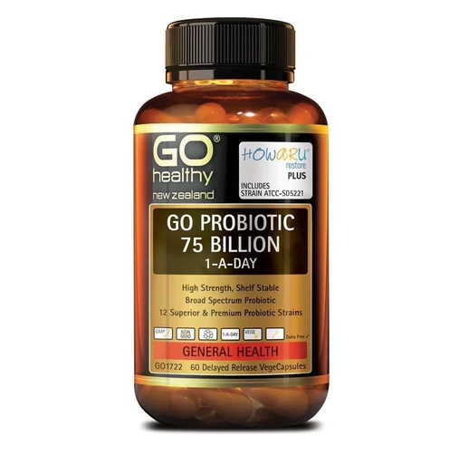 GO PROBIOTIC 75 BILLION delivers a potent, diverse probiotic blend with a total of 75 Billion live organisms, conveniently provided in a once-daily dose. Each capsule contains 12 premium probiotic strains, including the scientifically studied HOWARU restore® probiotic blend. Encased in a VegeCapsule utilizing Delayed Release technology, this formulation ensures the survival of probiotics in the stomach's acidic environment. GO Probiotic 75 Billion is crafted to establish and sustain a healthy gut microflora, promoting digestive health, immune function, and offering protection against the effects of antibiotics and prolonged medication use.