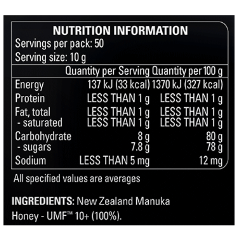This is 100% pure UMF™ 10+ New Zealand Mānuka honey. Taken from the wild, unpasteurised, halal, kosher and certified gluten-free. Pure goodness.