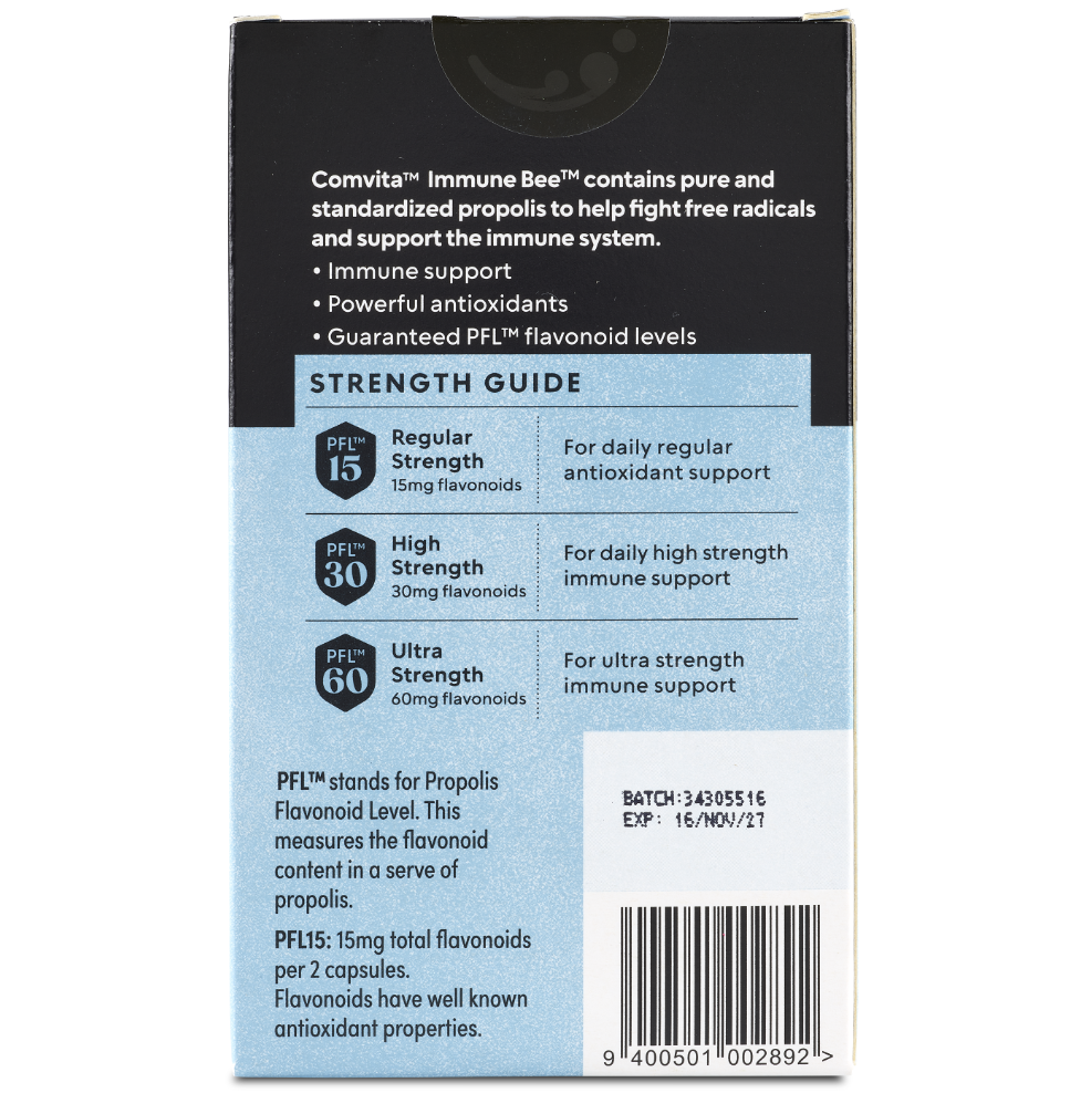 Comvita Immune Bee Propolis PFL15 is an everyday Regular Strength formulation containing natural, pure bee propolis for immune system and antioxidant support to fight free radicals and prevent against oxidative damage.