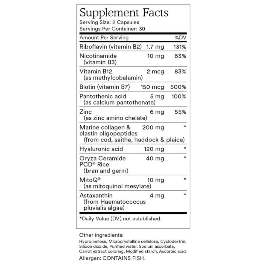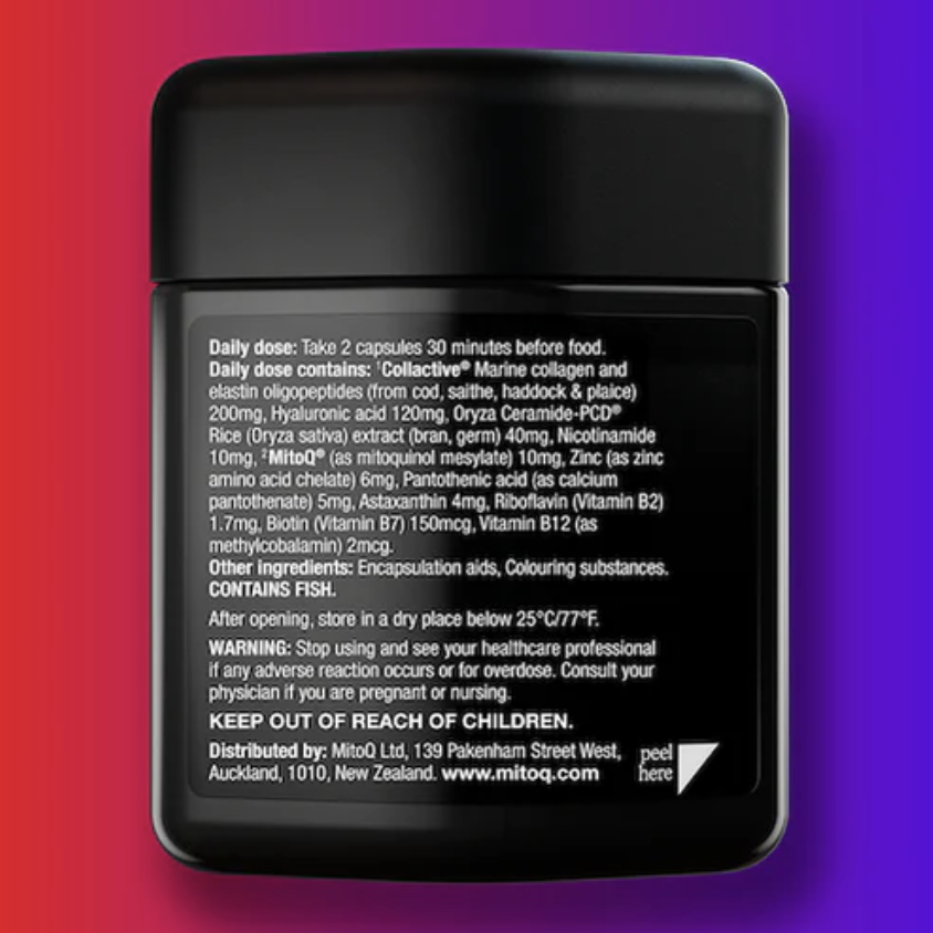 Collactive® Marine Collagen Complex, Oryza Ceramide-PCD® and Hyaluronic Acid. Each capsule also contains 5mg of Mitoquinol Mesylate, our world-first antioxidant molecule.